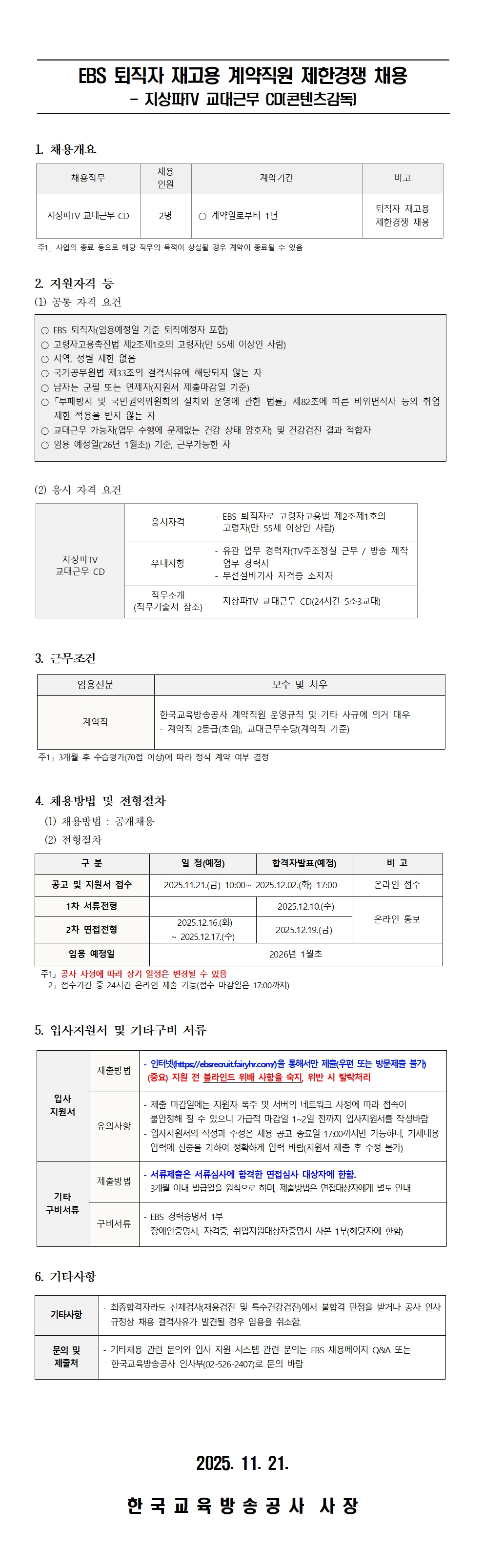 EBS 퇴직자 재고용 계약직원 제한경쟁 채용