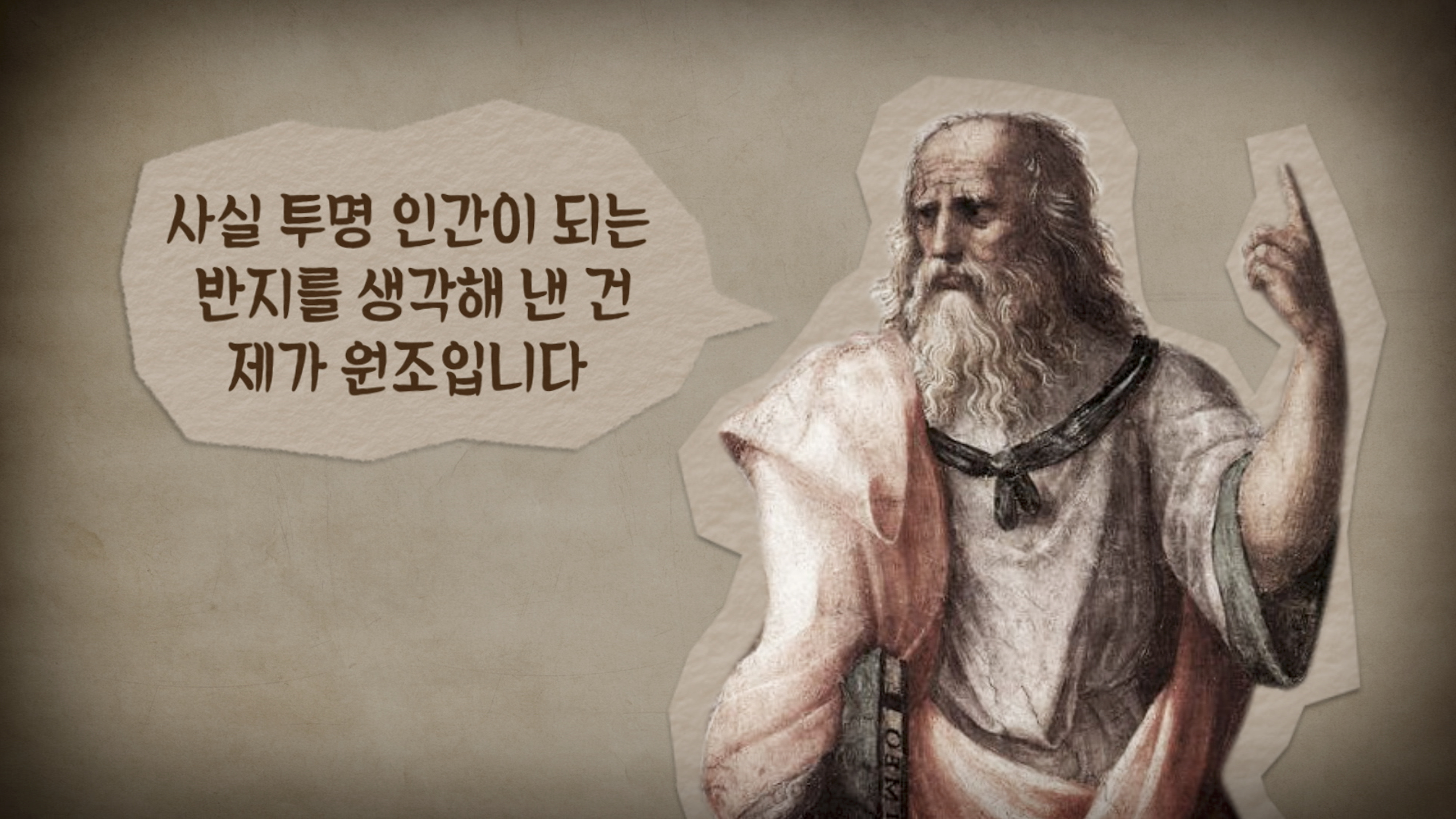 사실 ‘투명 인간이 되는 반지’는 플라톤의 『국가』에 나오는 ‘기게스의 반지’ 이야기에서 시작되었다. 평범하고 성실한 양치기 기게스가 우연히 ‘투명 인간이 되는 반지’를 얻게 된다. 충격적이게도 그는 궁궐에 침투해 왕비를 유혹하고 왕을 죽인 뒤 왕위에 오르며, 자신의 욕망을 모두 이룬다. 권선징악 따윈 없다는 옛이야기를 통해 플라톤은 무엇을 말하고 싶었던 것일까? 현대인들은 과연 이 반지의 능력을 제대로 사용하고 있을까? 기게스처럼 자신의 욕망을 충족하기 위해서만 반지를 쓰고 있는 것은 아닐까? 모두가 절대 반지를 쉽게 손에 얻어 투명 인간이 되는 세상에서 정의란 무엇인지 질문해 본다.