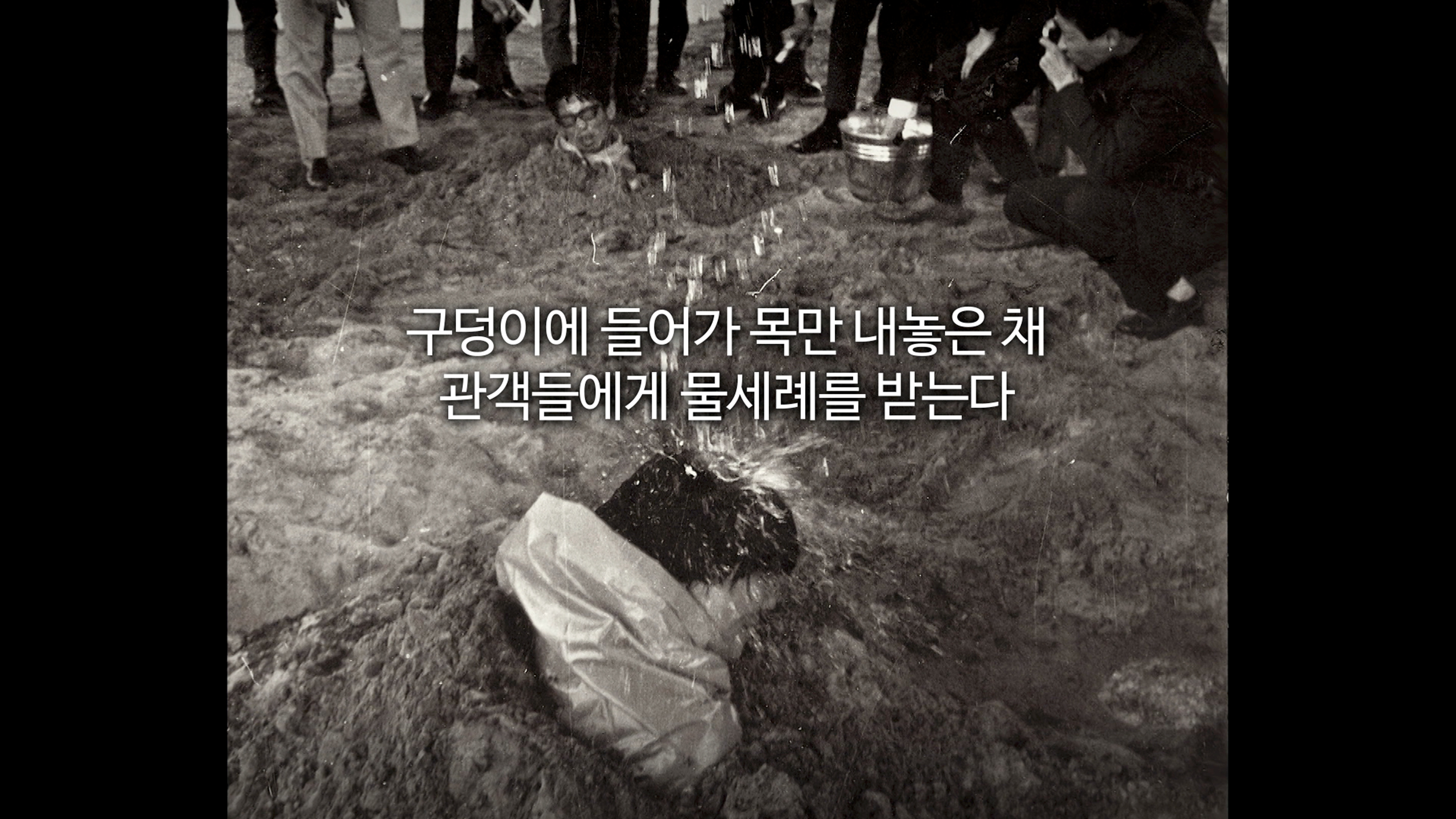 1968년, 세 명의 청년 작가들이 한강 변에 스스로 구덩이를 파고 들어갔다. 그들은 목만 내놓은 채 그곳에 묻혀 관객들에게 물세례를 받았다. 무덤에서 나온 그들은 비닐에 흰 페인트로 예술을 탄압한 기성세대를 고발하는 글을 쓰고, 그것을 태우는 화형식을 했다. 당시 터졌던 국전(대한민국미술전람) 심사 비리를 고발, 비난하는 퍼포먼스 '한강변의 타살'이다.